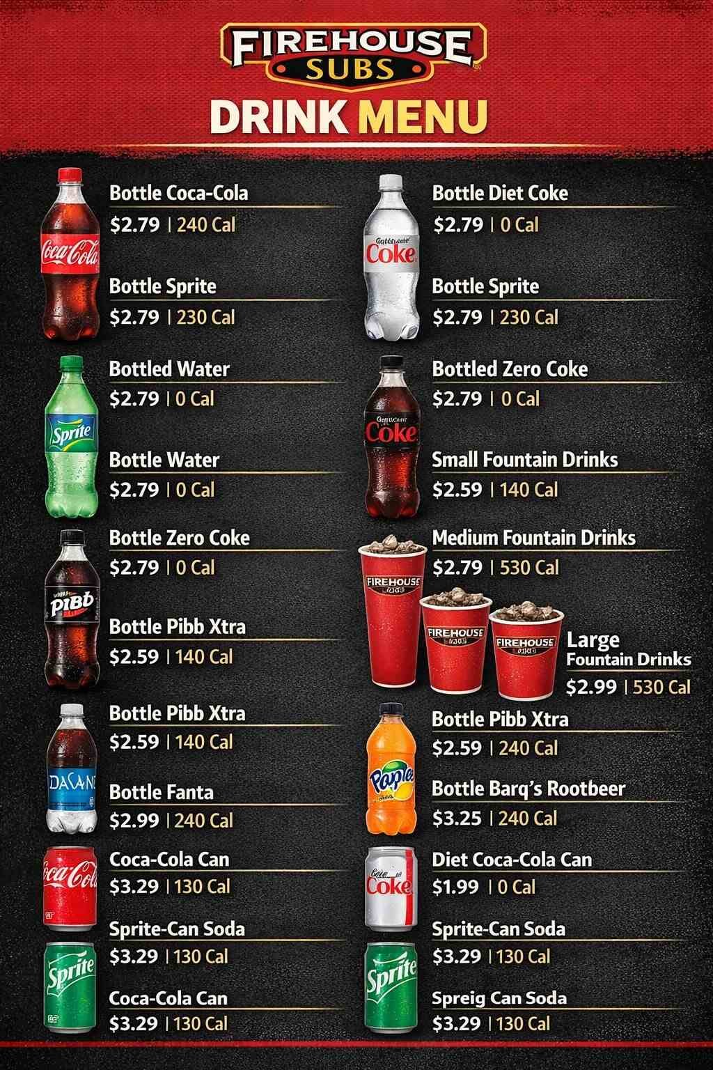 Firehouse Subs typically sells bottled Coca-Cola, Diet Coke, Sprite, and Coke Zero. Bottled sodas are served chilled and are popular for takeout orders.