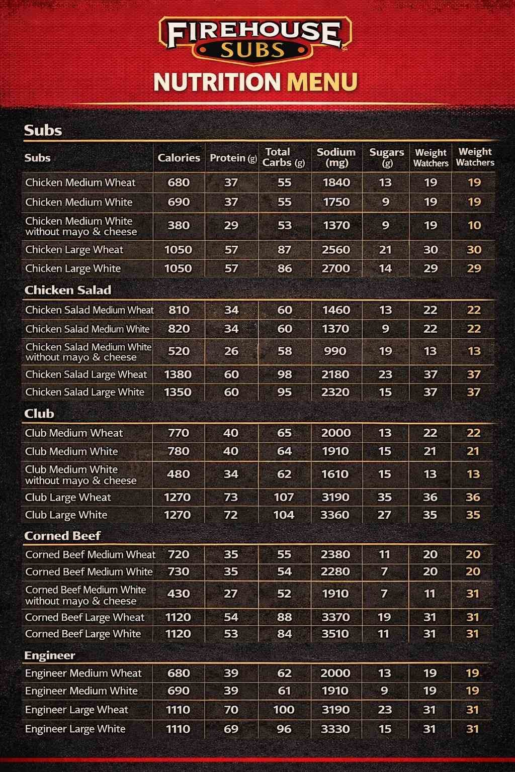 The Firehouse Subs Nutrition Menu clearly shows calories, protein, fat, carbs, and sodium so customers can make smarter food choices. Since their steamed subs can be filling, Firehouse Subs offers three sizes—Small, Medium, and Large—to help with portion control.